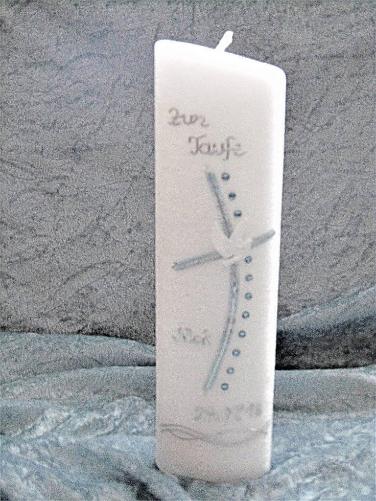 Las velas que uso llevan la marca de calidad RAL. Es sinónimo de velas de alta calidad y pobres en hollín. El motivo puede consistir en placas de cera, tiras, imágenes (fotos) y / o partes acabadas o incluso puede pintarse, como la vela bautismal 'Benjamin'.